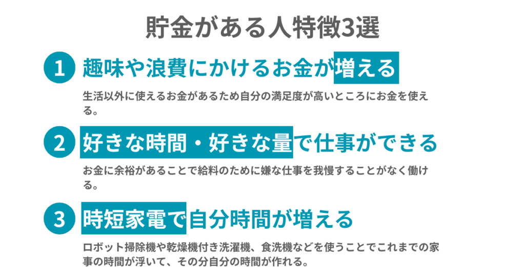貯金がない人と違い、貯金があれば働くことを選択できたり時間をお金で買ったり多くの選択肢を持つことができます。